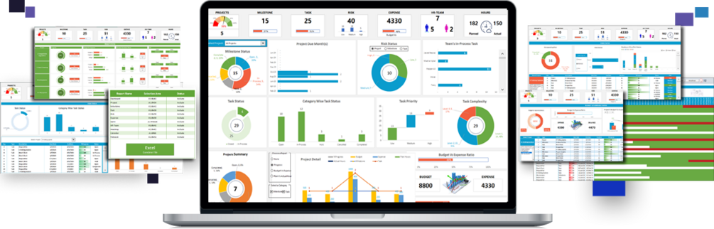 The professionally designed template and utilities shown below were entirely from ProjectManagers included options and require no custom coding. You can easily change the design to suit your needs. Enter your plans in the Data Sheet and analyse you Projects, Resource and Tasks using Dashboard and Powerful Section of the template.
